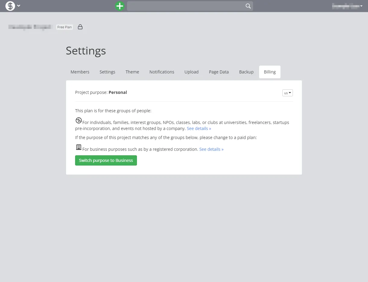 • Billing: Allows you to change the purpose of the project, whether it is for free personal use or for paid business use.