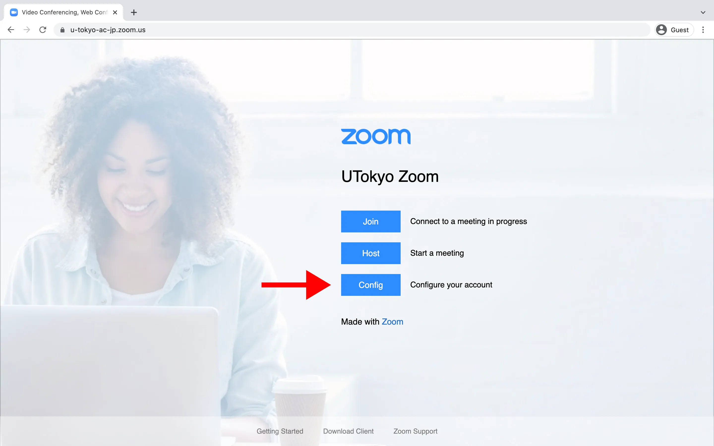 - A page labeled “UTokyo Zoom” will appear. Click the “Config” button on this page.