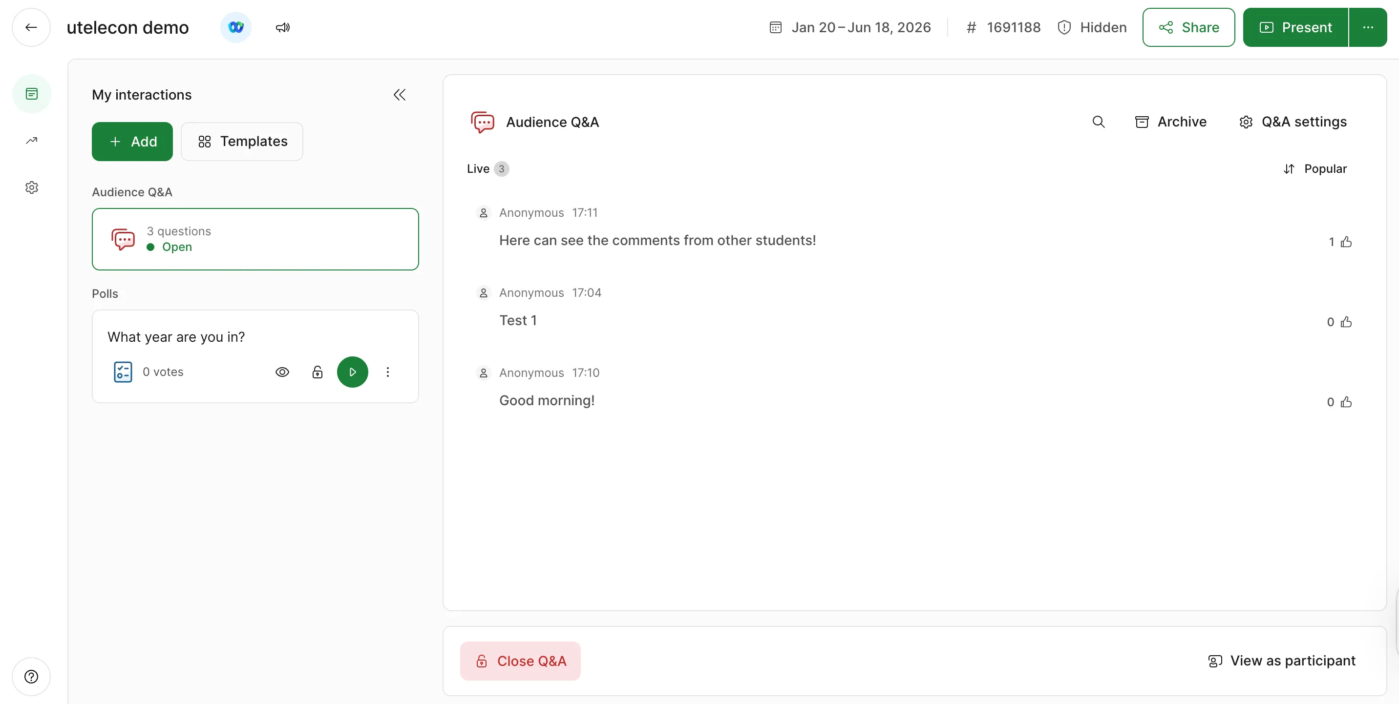 • Delete: Delete questions/comments from students.