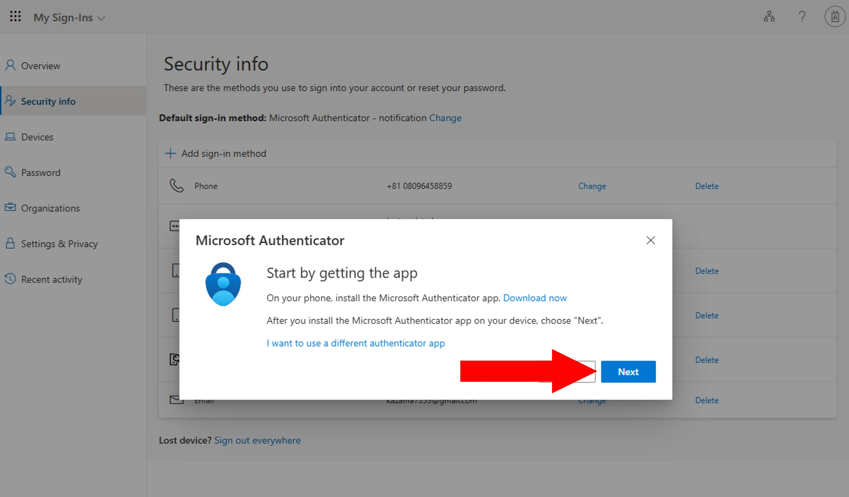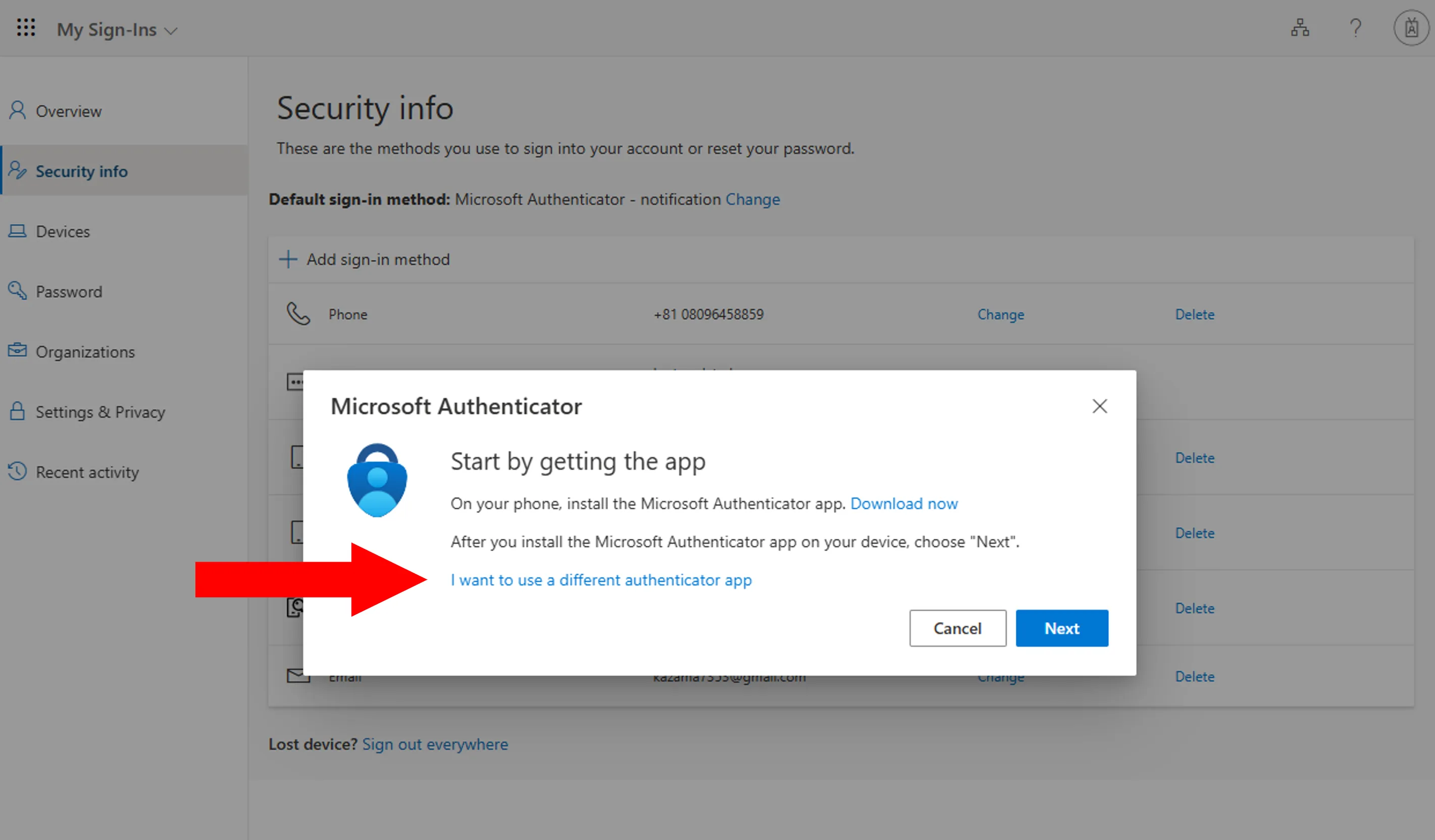 Next, add alternative verification methods (second and subsequent methods) from the Security info page.