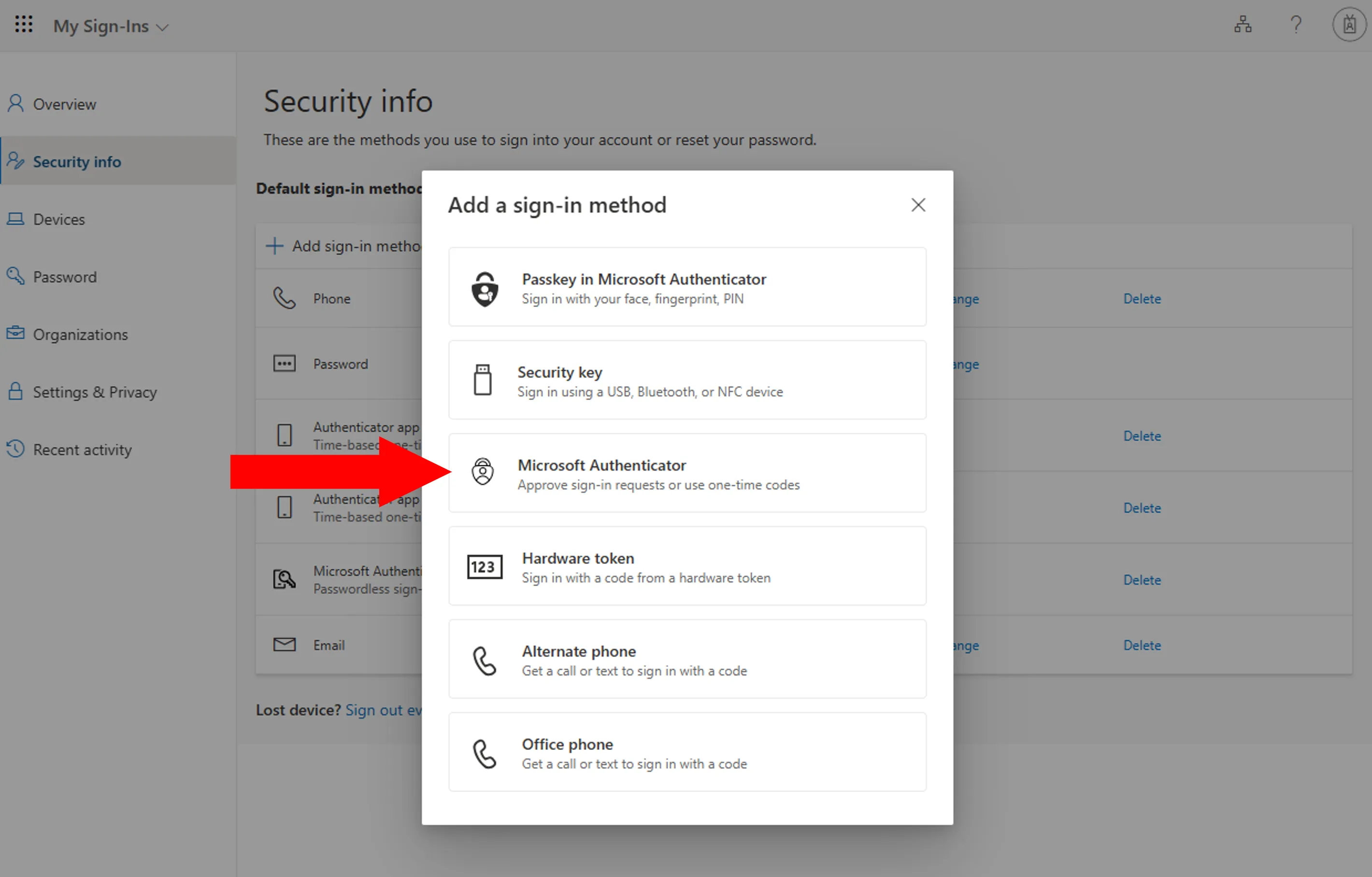 For “Add a sign-in method”, select "Microsoft Authenticator".