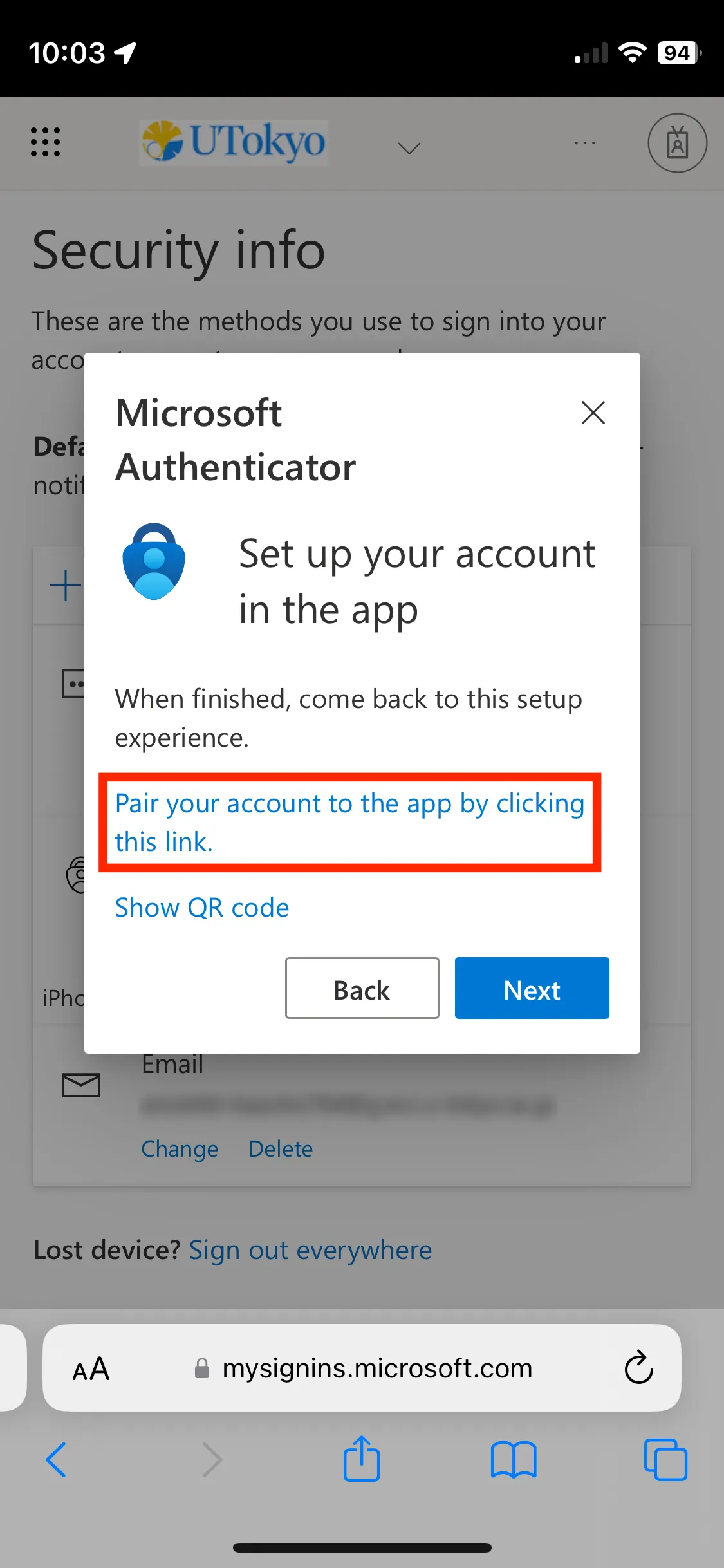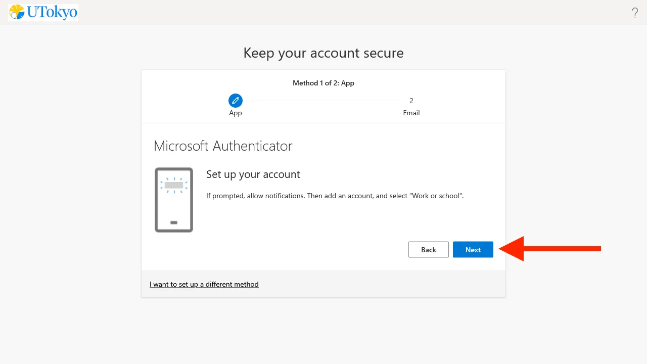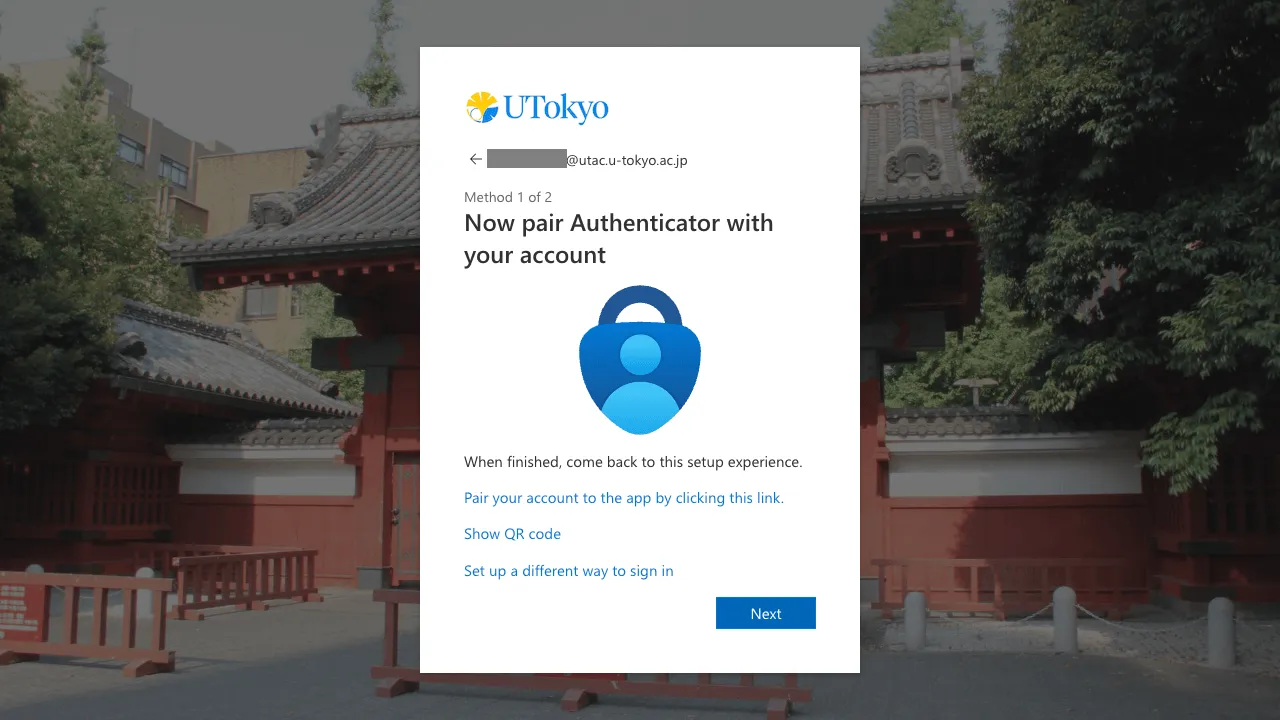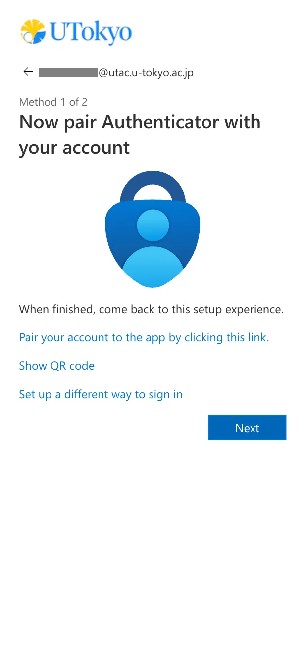 - Smartphone (the same device where you installed the Microsoft Authenticator app): Click “Pair your account to the app by clicking this link”. Check that your UTokyo Account appears in the Microsoft Authenticator app. Go back to the browser and click “Next”.
