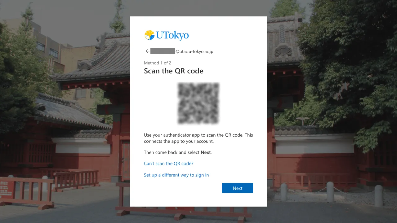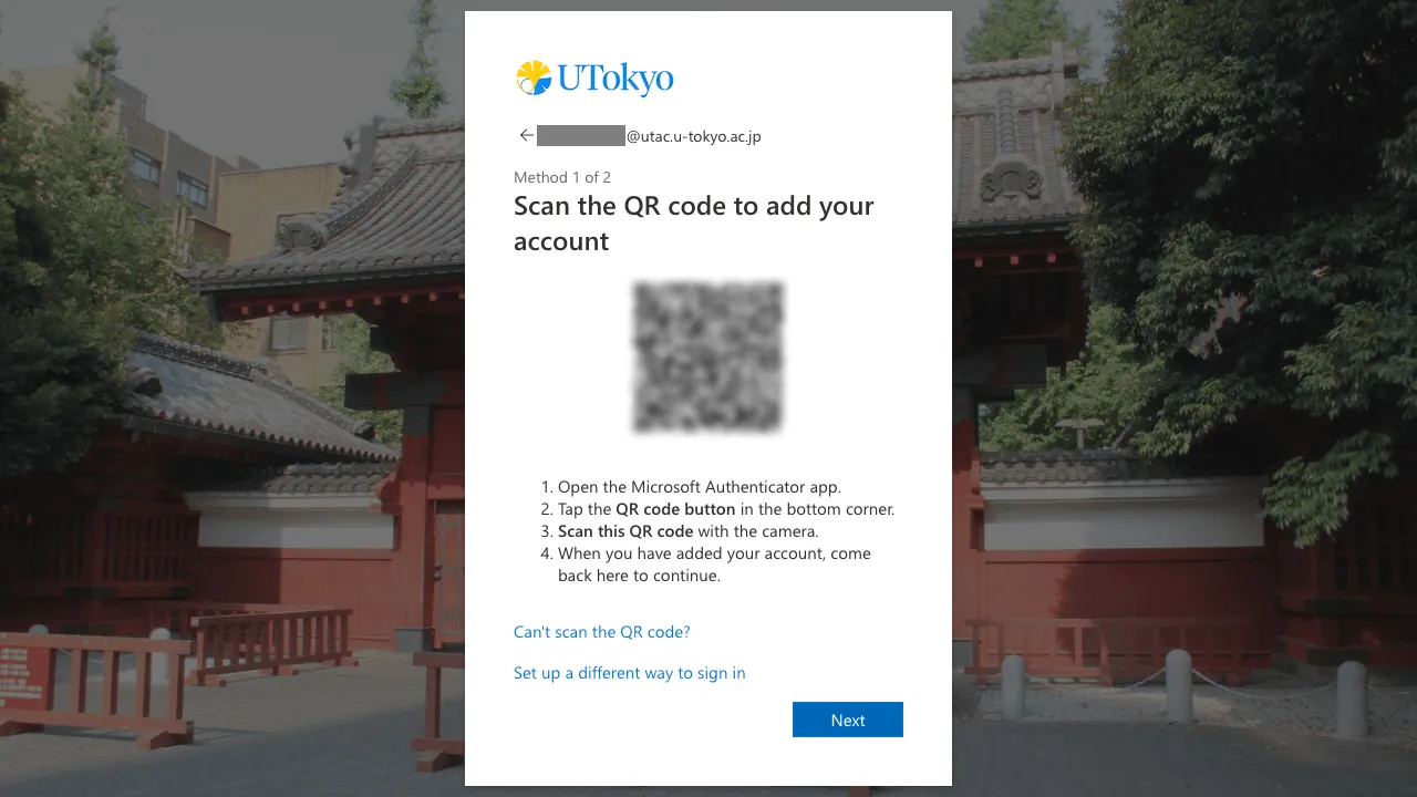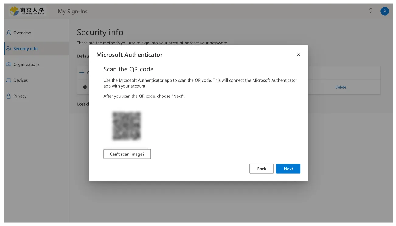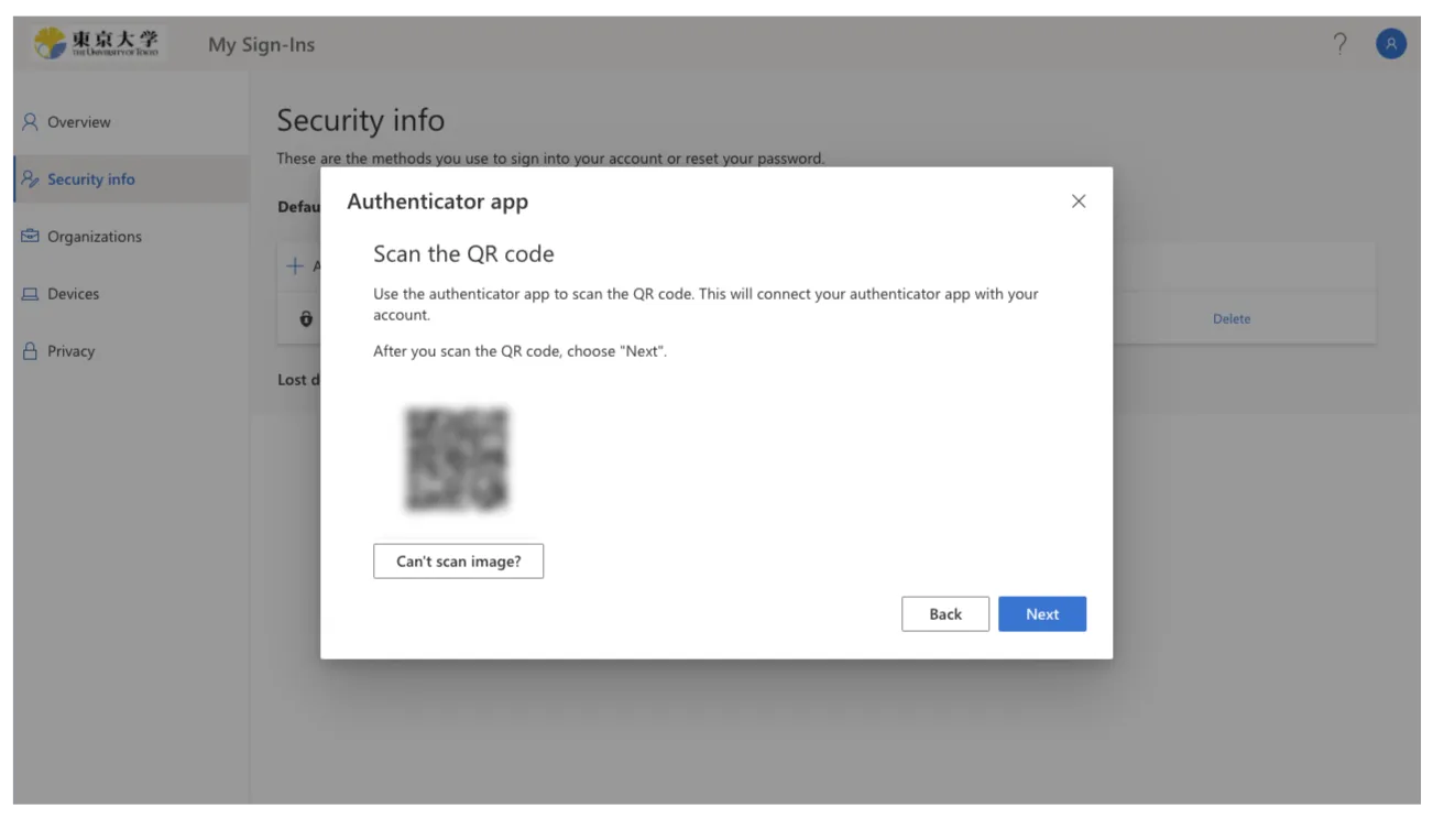 Follow the instructions until you reach the QR code page. Scan the QR code with your authenticator app and complete the setup procedure. If you want to use YubiKey and Yubico Authenticator app, see “Instructions on how to use the Yubico Authenticator for the Multi-Factor Authentication of UTokyo Accounts” page for details.