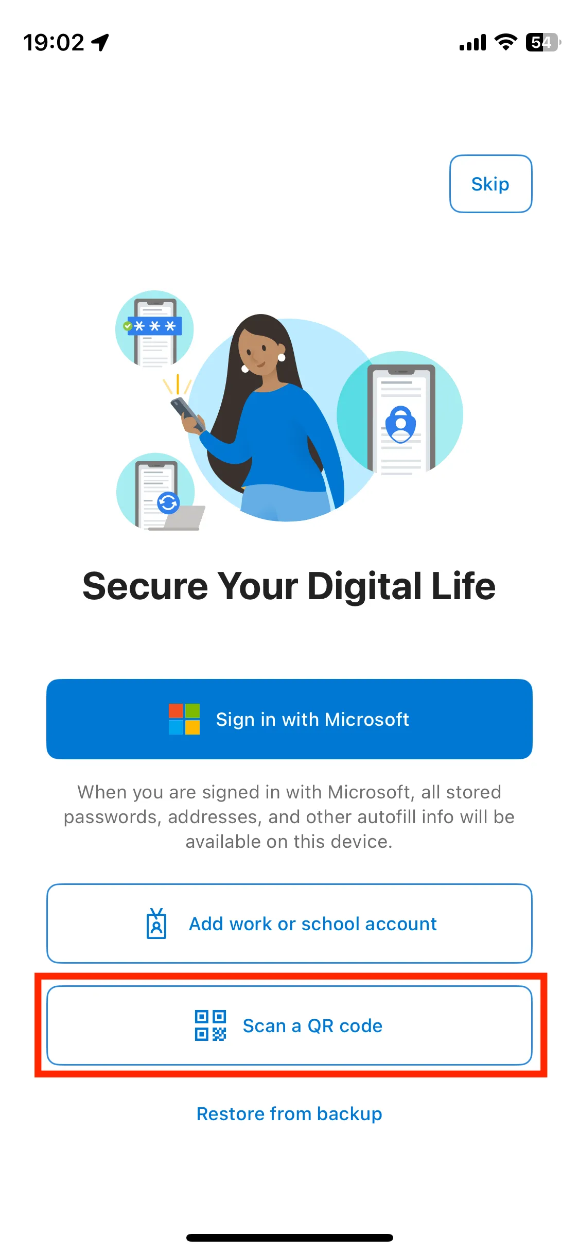 - If “Secure your digital life” screen like the first image below is shown, tap “Scan a QR code”. Instead, screens like the second or third images is shown, tap the ”+” icon in the upper right, and select “Work or school account” and “Scan a QR code” in turn. In all cases, you may be asked to allow the app to access the camera, so then do.
