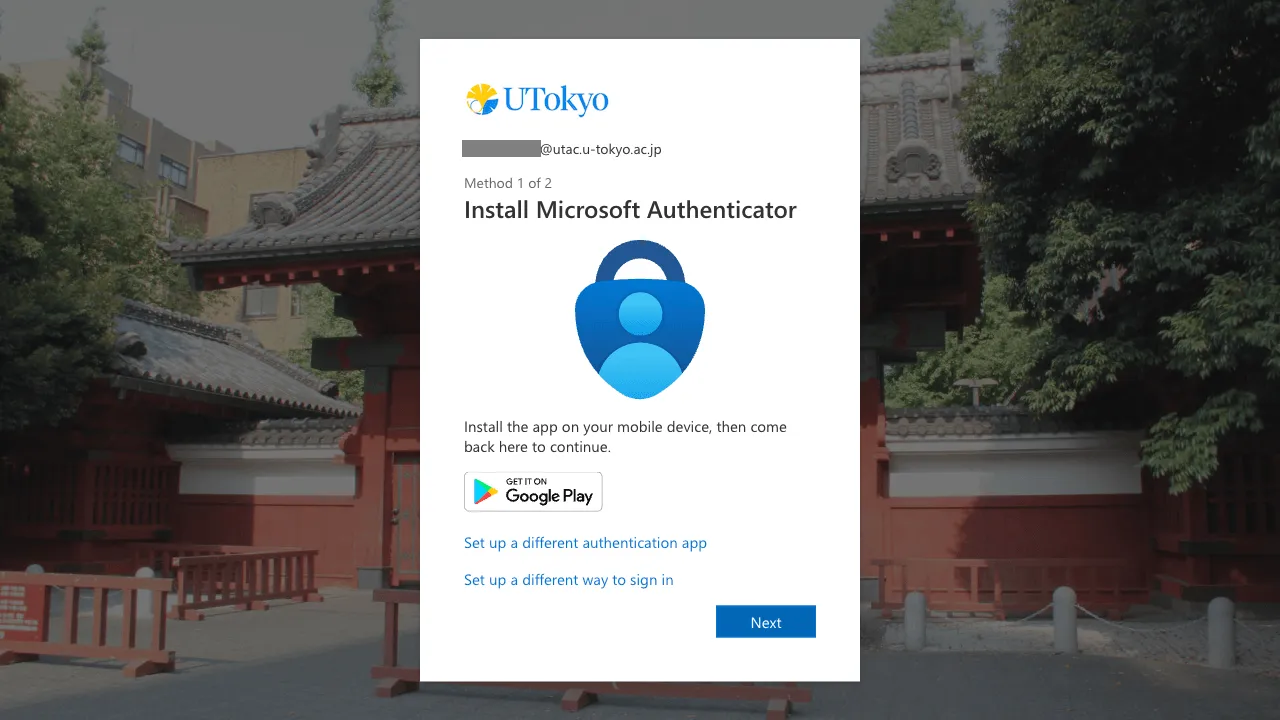 “Microsoft Authenticator” is an MFA authentication application provided by Microsoft. Using this app is convenient since UTokyo Account’s MFA adopts Microsoft’s system. If you have more than one phone, you can register the same authenticator apps on these phones, making them two or more verification methods.