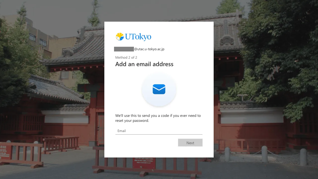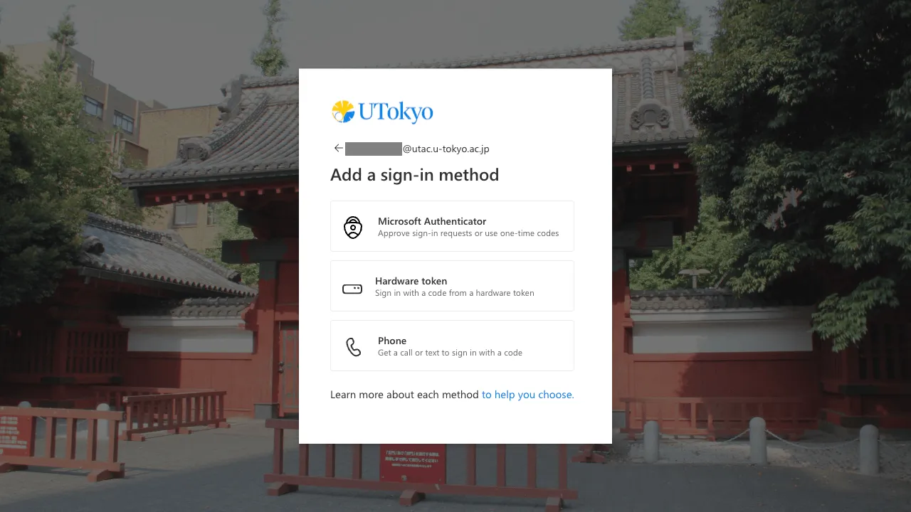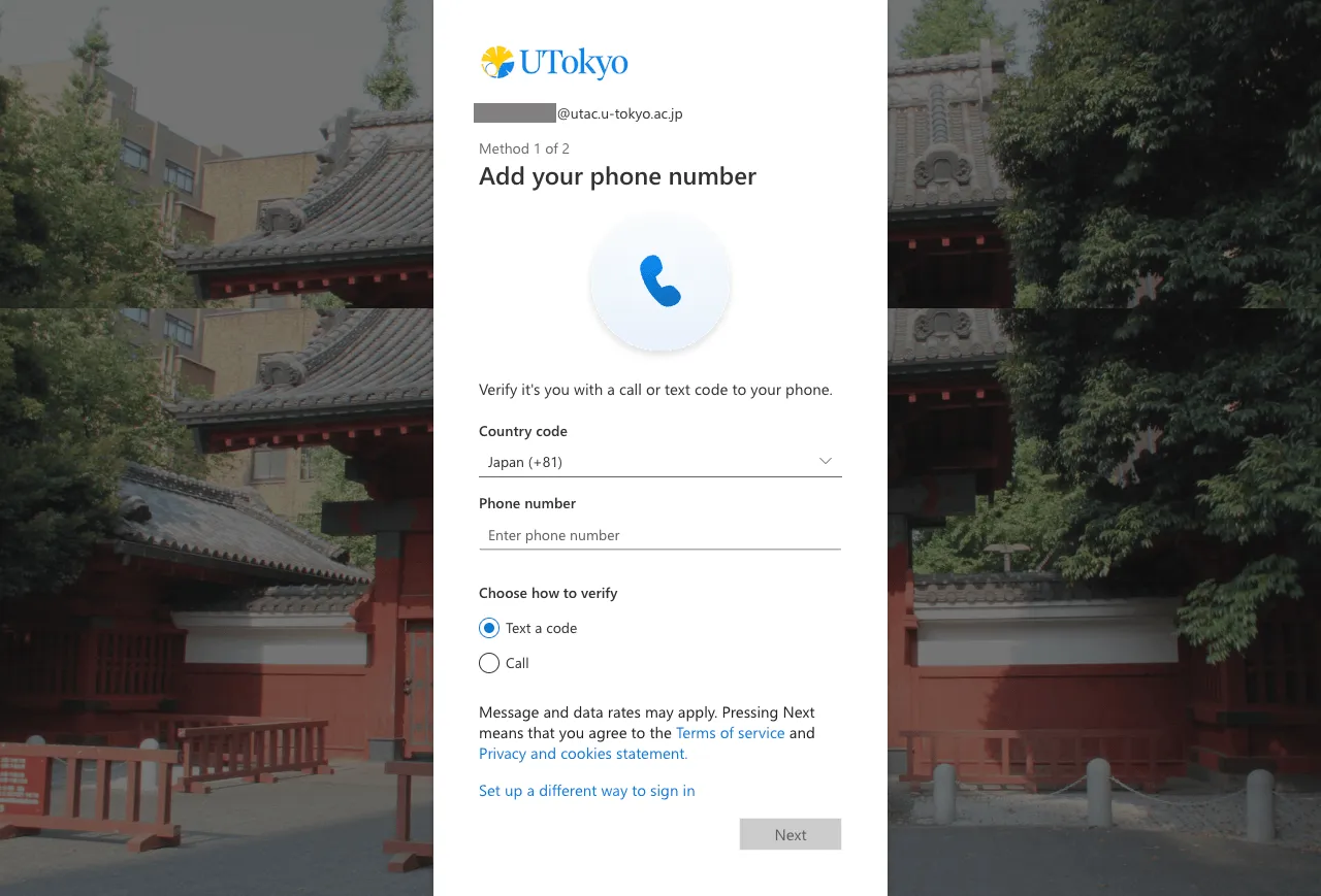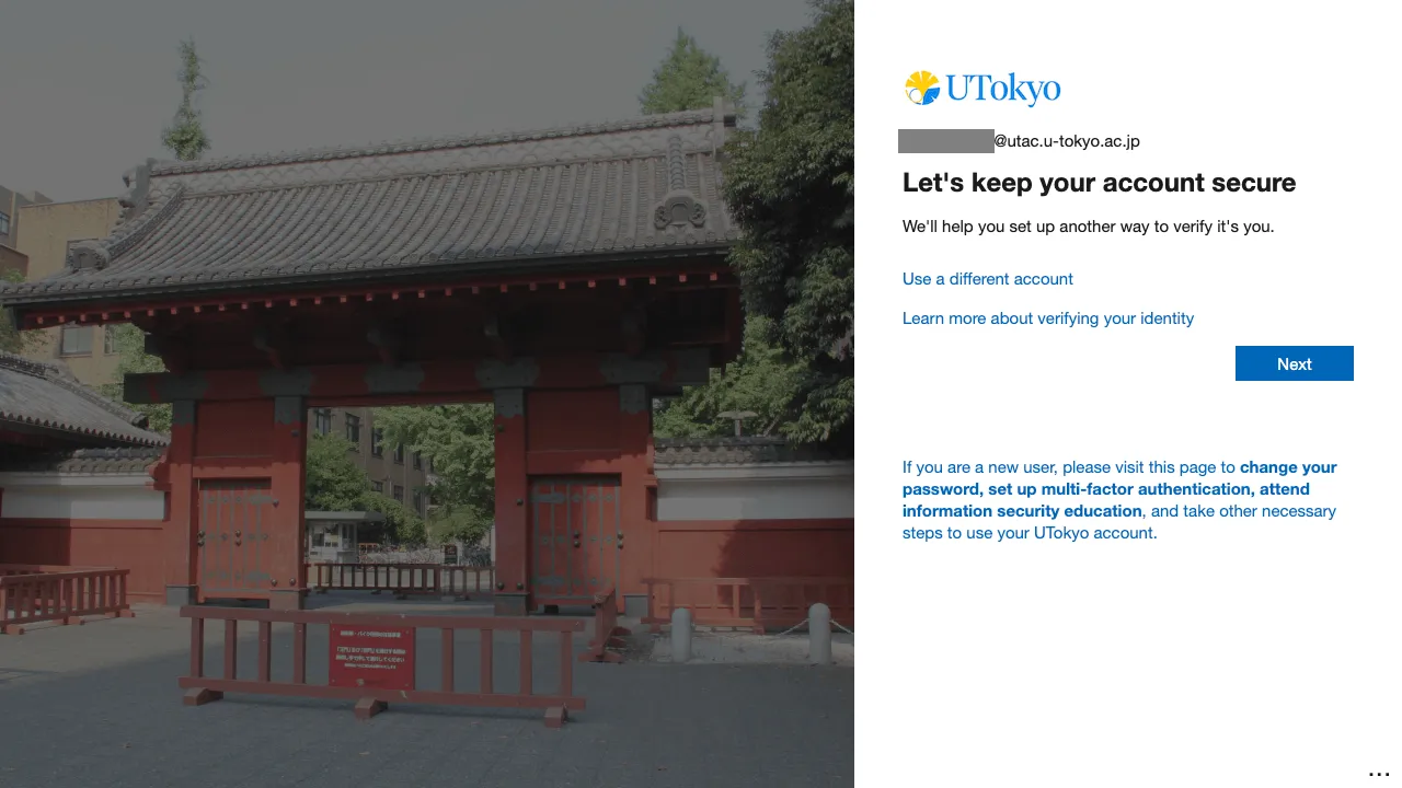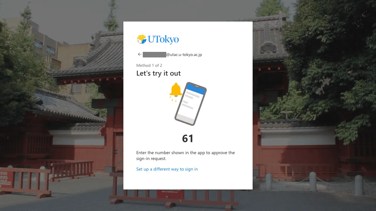 Once the MFA is enabled, you will be asked to verify your identity with the SMS or authenticator apps you registered every time you sign in to your UTokyo Account. Be well aware that if you lose access to the registered verification method (smartphone apps, phone number, etc.), you will be unable to sign in to your UTokyo Account.