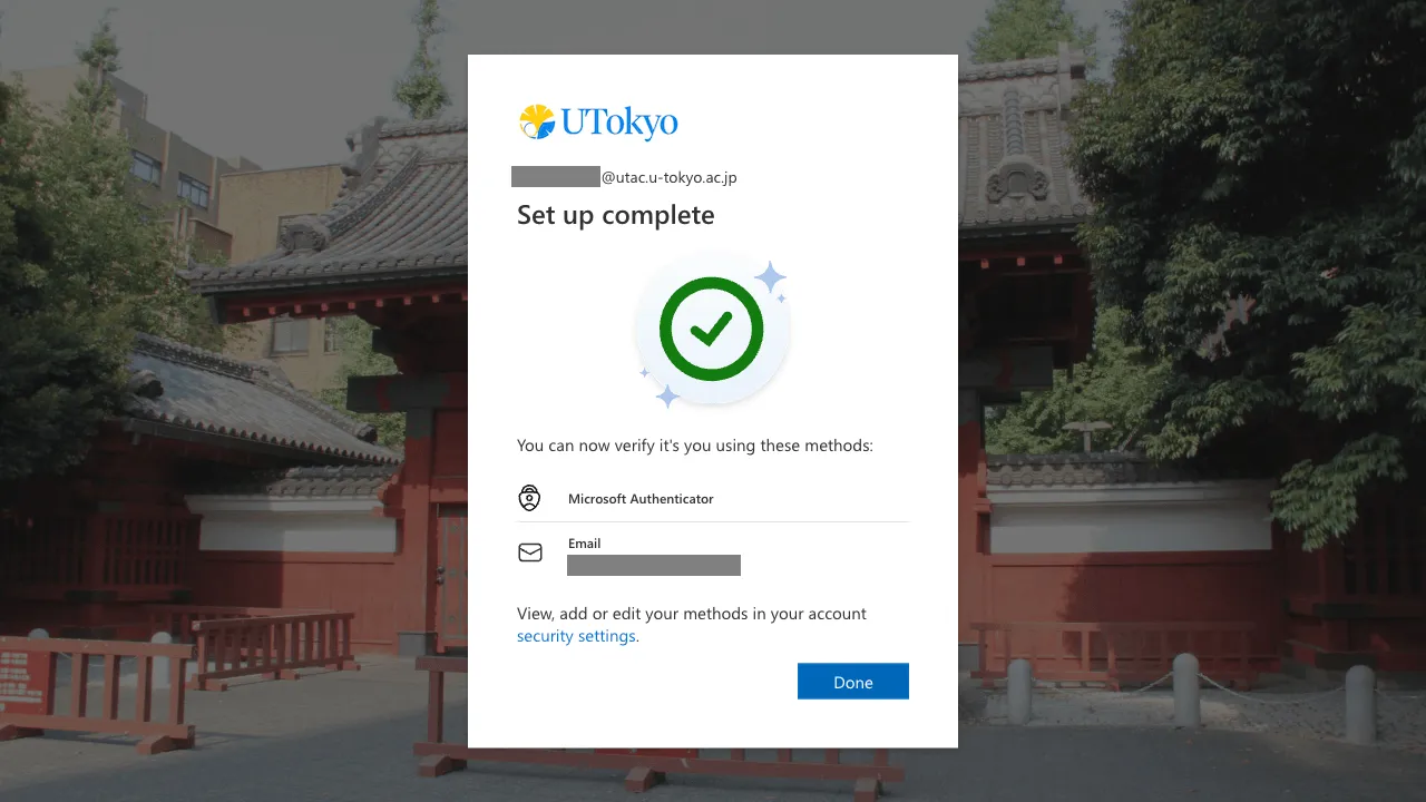 You have completed the initial setup procedures for UTokyo Account, but it will take about 30 minutes for the account settings to be reflected in the system after these procedures. If you want to use systems that do not allow you to sign in until the multi-factor authentication settings are completed, please be patient and wait for a while.