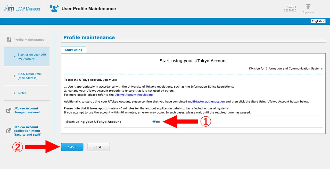 - Read the UTokyo Account instructions carefully, and find “Start using your UTokyo Account” at the bottom of the page. Answer “Yes” and click “SAVE”.