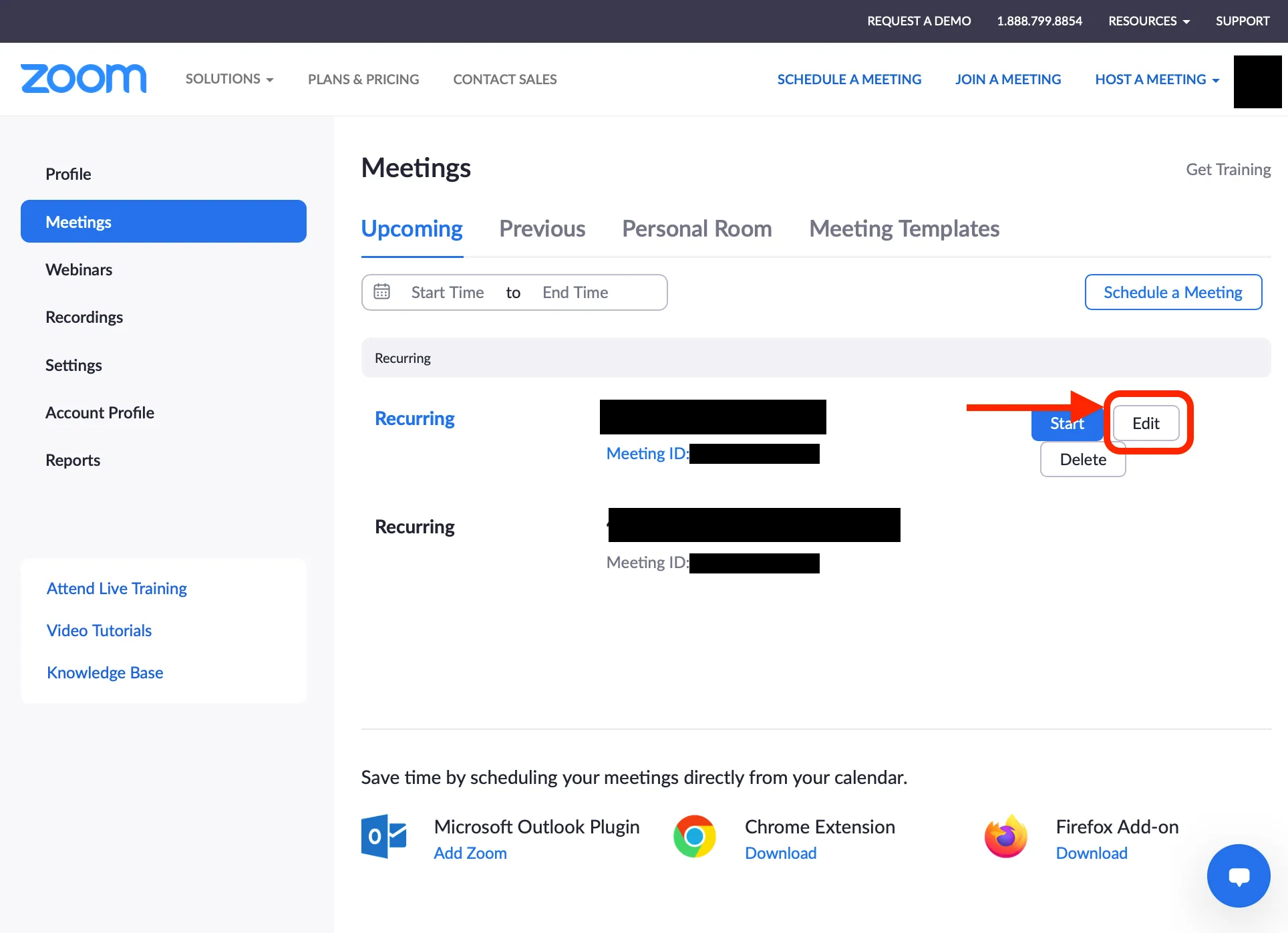 - To check or modify the settings of previously scheduled meetings, hover your mouse over the meeting in the list and click the “Edit” button on the right side.