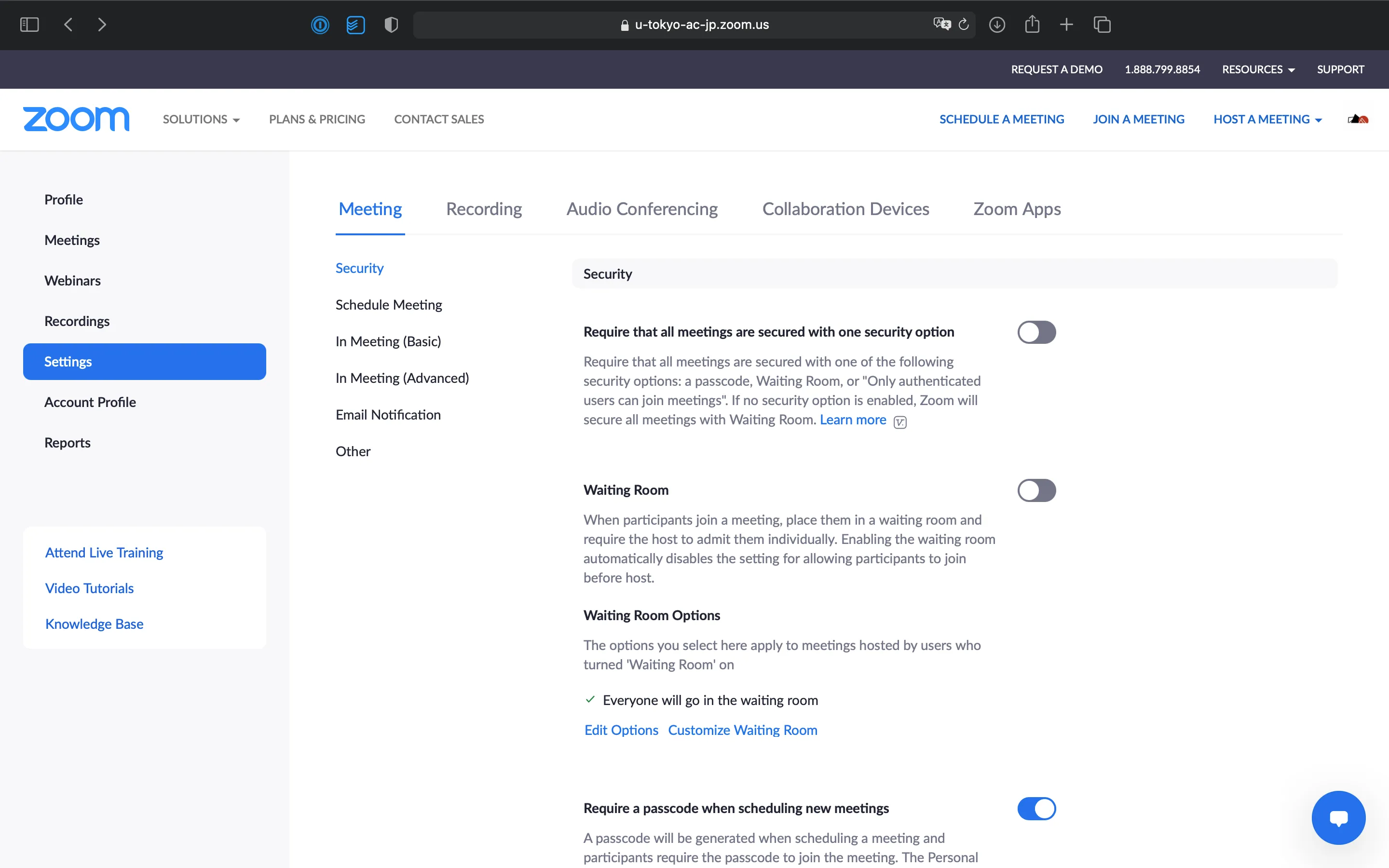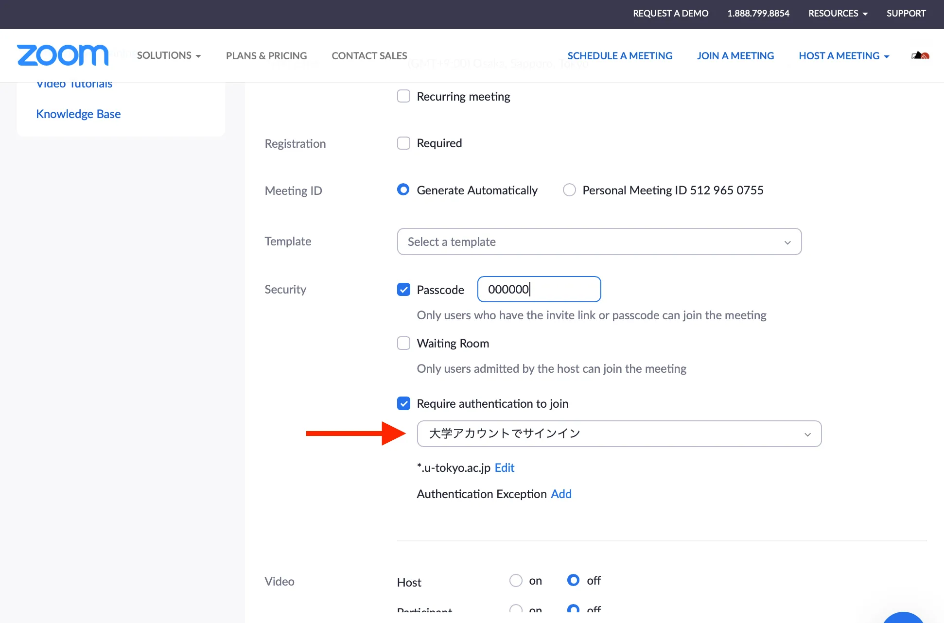 Configure the settings under “Require authentication to join” in “Security”. If you turn it on and select “大学アカウントでサインイン(Sign in with university account)”, only participants who have signed in to their UTokyo Zoom account are able to join the meeting. Additionally, please check that the domain shown under “大学アカウントでサインイン(Sign in with university account)” is set to