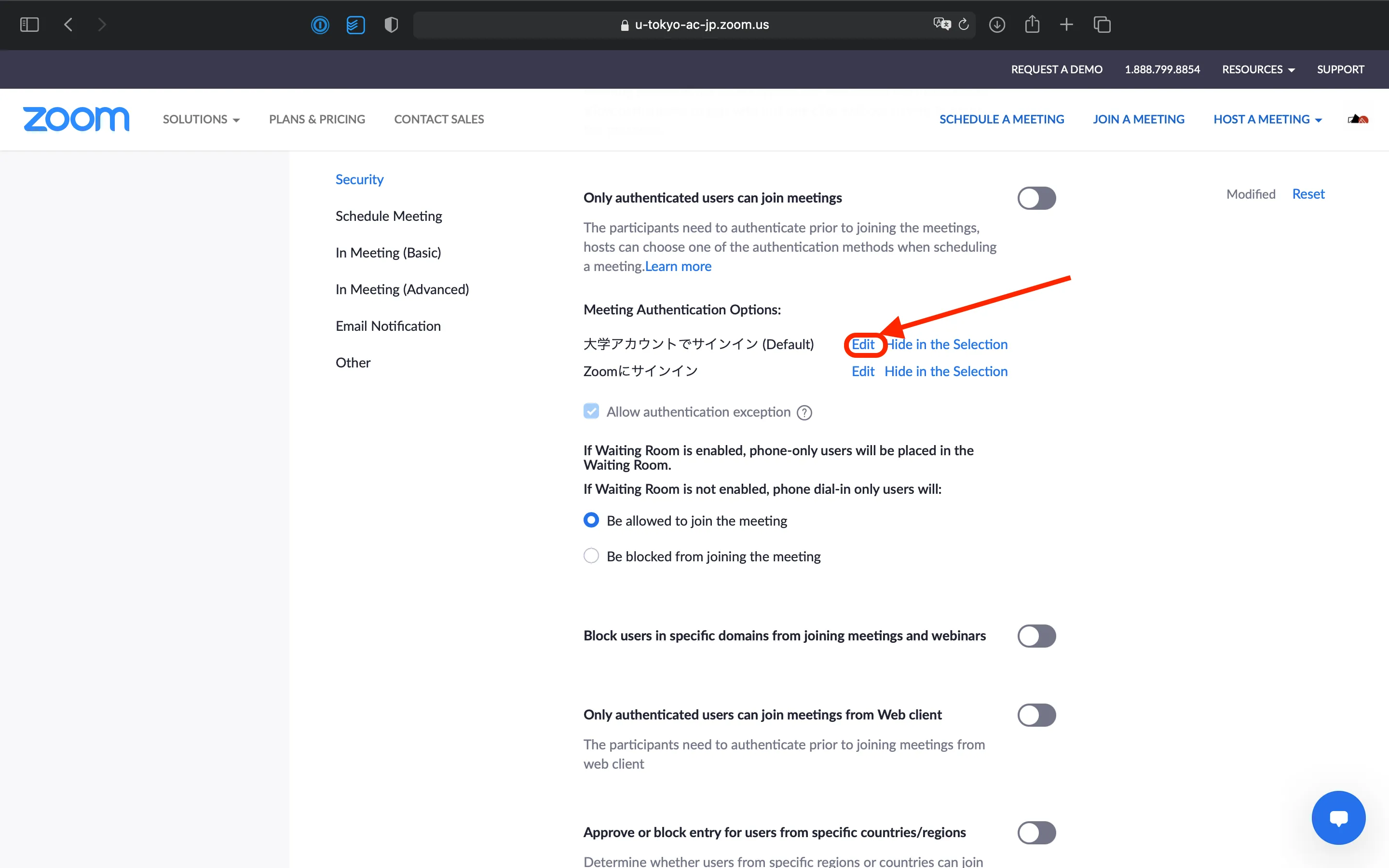 - Click the “Edit” button under “Meeting Authentication Options-大学アカウントでサインイン (Default) (Sign in with university account (Default))”