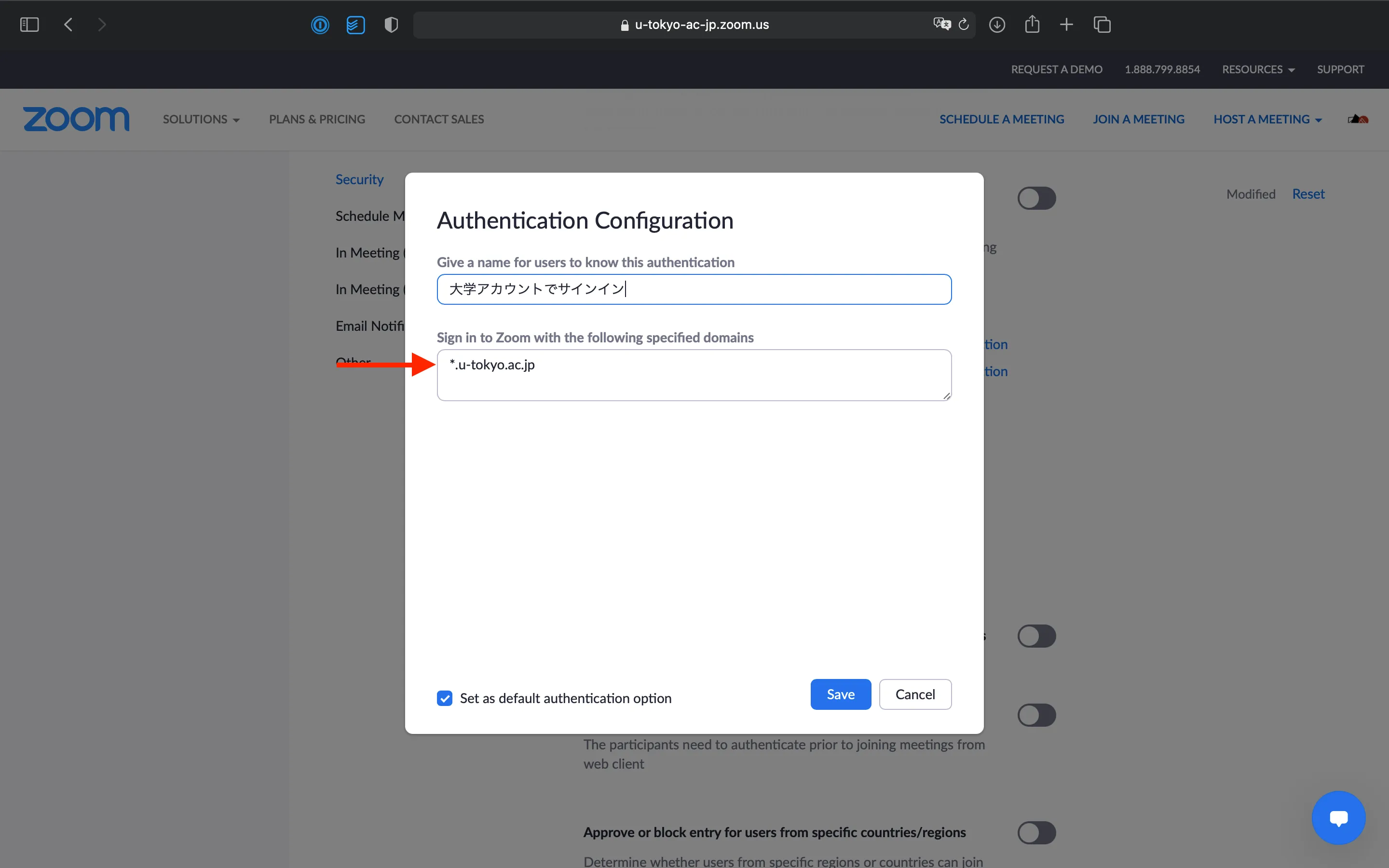 *.u-tokyo.ac.jpin the field of “Sign in to Zoom with the following specified domains”. If not, please change it to*.u-tokyo.ac.jpand save your settings.