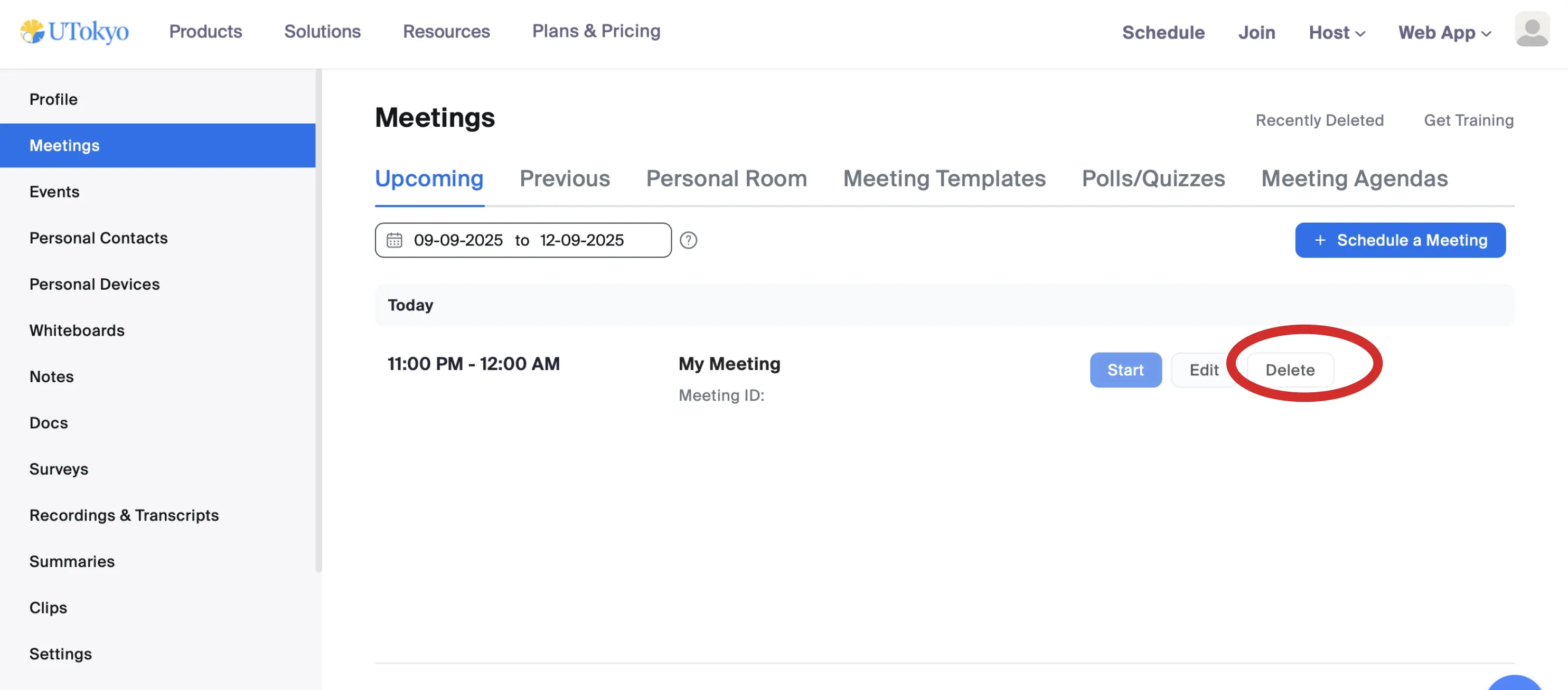 - Click Delete to delete the meeting.