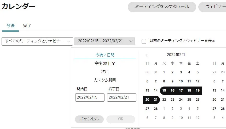- ホーム画面には一週間以内に開催されるミーティング・ウェビナーが表示されます.それ以降のミーティングを選択したい場合はホーム画面左の「カレンダー」をクリックして,日付を指定して検索します.